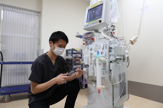 入職してから丸5年ほど血液浄化センターで透析を担当し、1年半ほど前にME管理室に異動しました。今は、ICU(集中治療室)での透析業務を中心に、ECMO(体外式膜型人工肺)や人工呼吸器など生命維持装置の操作・管理のほか、手術支援ロボット「ダビンチ」のセットアップ、ペースメーカの埋め込み手術などにも立ち会っています。