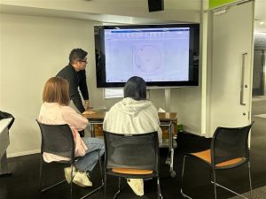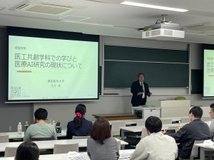 模擬授業では、笠井教授が医工連携の現状と、その分野を担う人材の必要性について解説しました。また、研究室メンバーがこれまで関わってきた研究成果について説明を行いました。国田准教授は、細胞の動きを数理モデルとして捉え、仮想空間上に再現する「デジタルツイン」の考え方について解説しました。