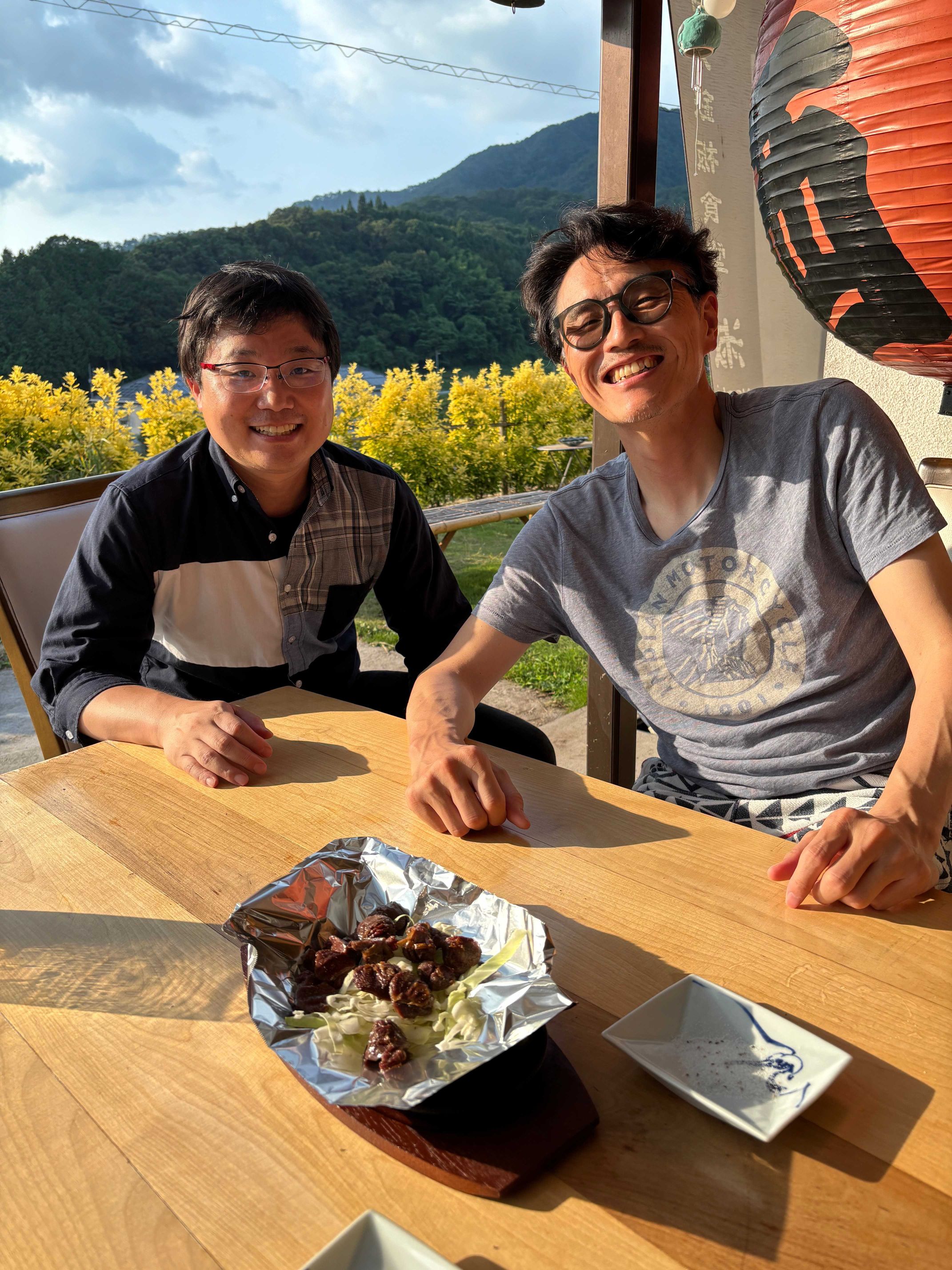 生物資源科学部生命環境学科生命科学コース、岡田守弘准教授にお誘いいただき、講義後は岡田研究室の学生さんの研究発表をもとにディスカッションし、大学近くの山中にある開放的なお店でお好み焼きとビールをいただきました。