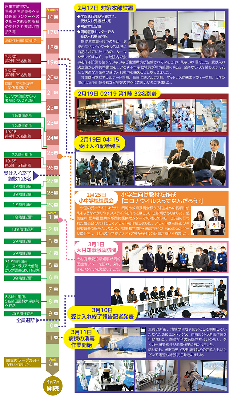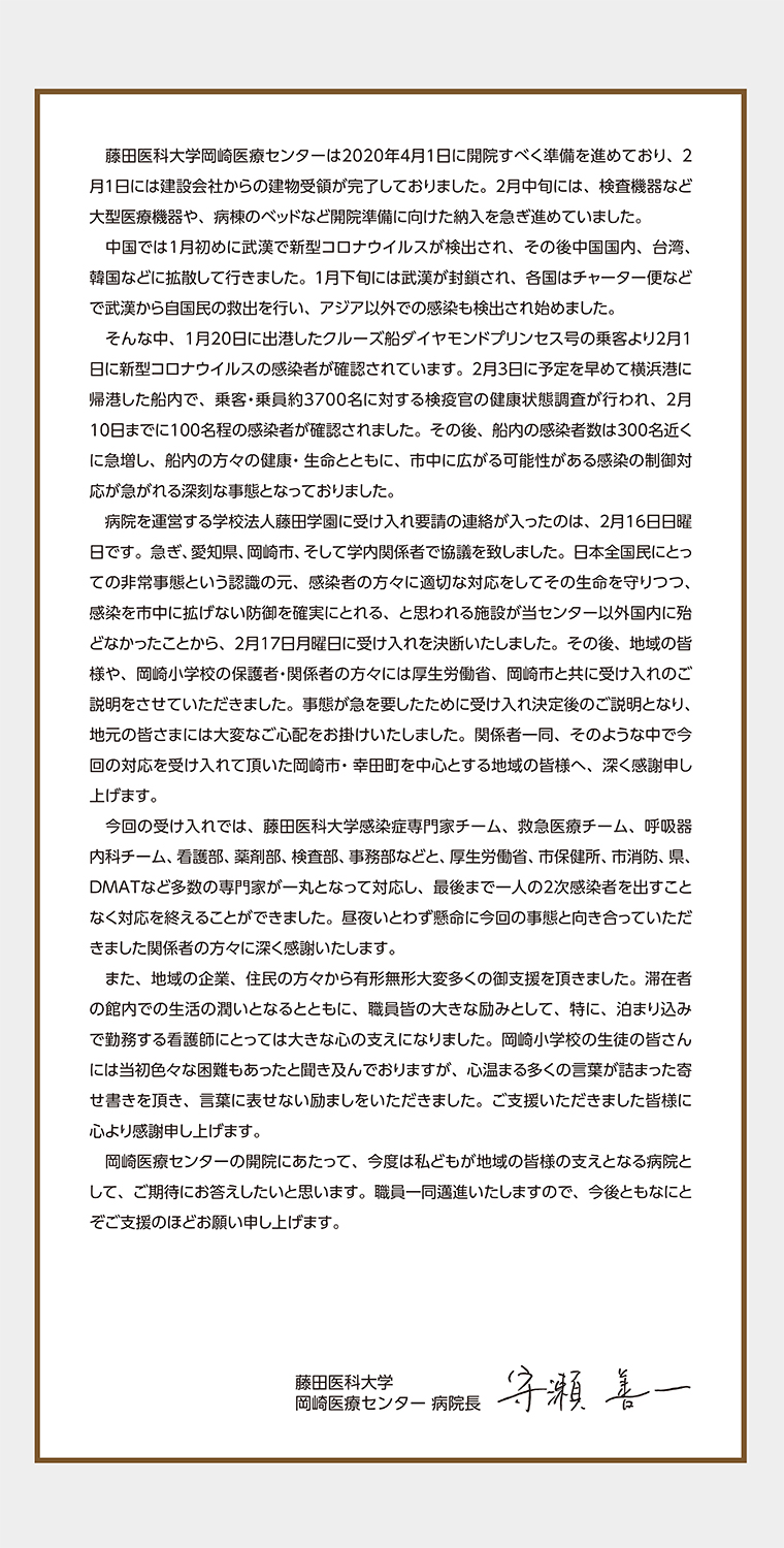 政府の要請を受け、藤田医科大学 岡崎医療センターは横浜港で検疫中のクルーズ船「ダイヤモンド・プリンセス」号より、無症状病原体保有者およびその同行者(濃厚接触者)128人を受け入れました。2月19日から26日の間に受け入れを行い、肺炎疑い者の他医療機関への搬送などを経て、最大時106名が滞在した後、3月9日に全員退所しました。