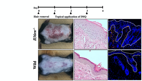 Microscopic observations of the back skins of two mice—one with the IL-36 deficiency and another wild type—after topical application of psoriasis-inducing imiquimod show that the former developed psoriasis like lesions after 3 days of application. They also showed greater neutrophil infiltration