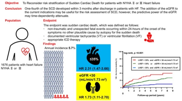 Image caption: This study by Fujita Health University researchers revealed that kidney function, considered in terms of estimated glomerular filtration rate (eGFR), can be used as a predictor for SCD in patients with congestive heart failure.