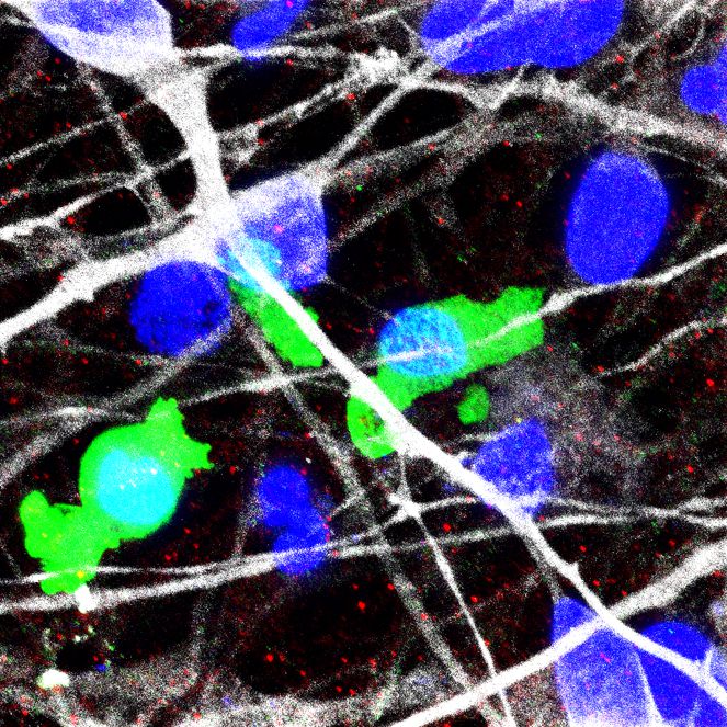 (white: neurites of hiPS cell-derived neurons, green: macrophages from individuals with ASD, red: PSD95, a scaffolding protein in the postsynaptic region, blue: nuclei)