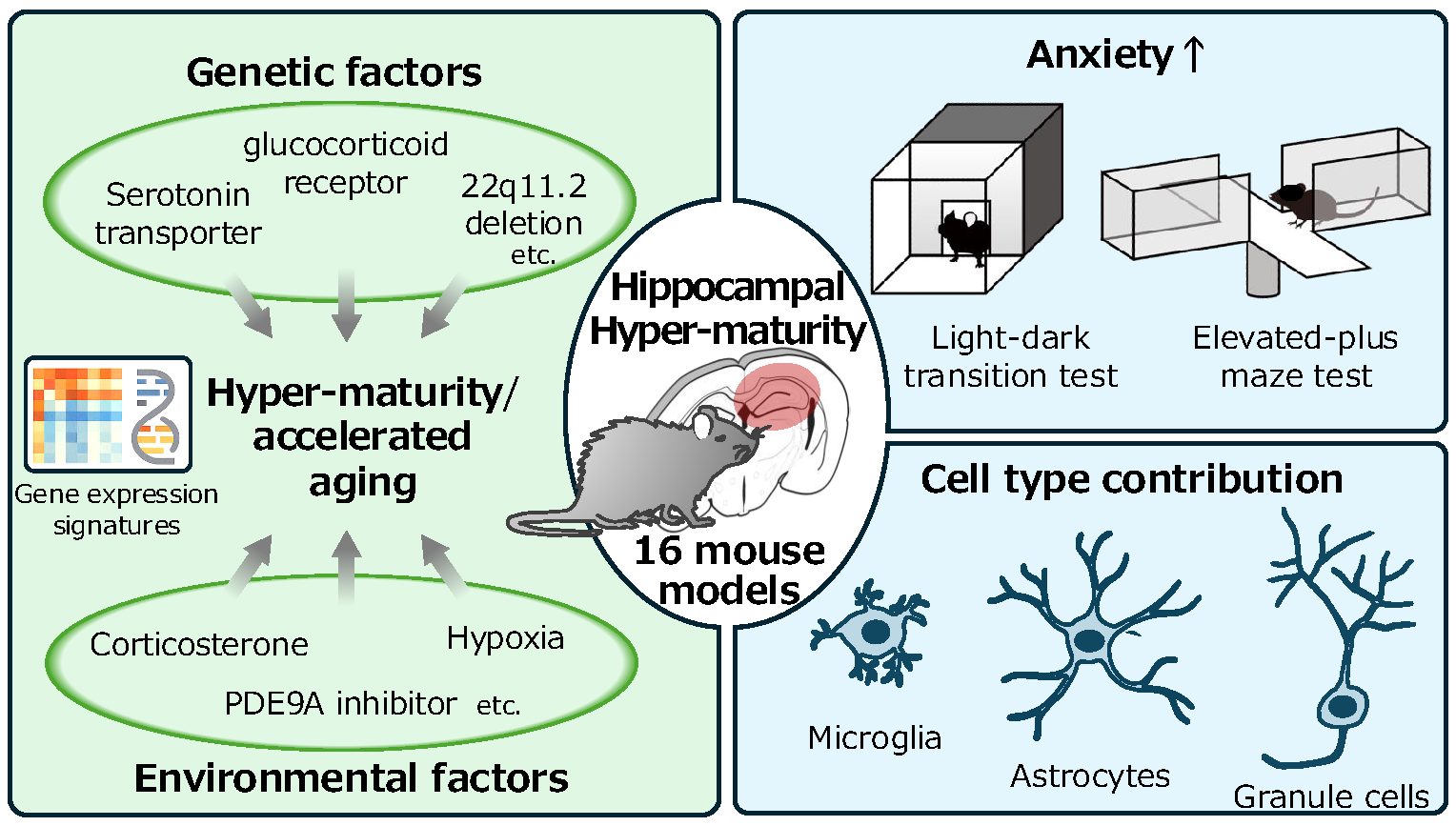 Researchers at Fujita Health University and collaborators identified "hyper-maturity" in the hippocampus, excessive cellular aging, as a shared abnormality in mouse models of anxiety and other psychiatric disorders. By screening public transcriptomics datasets, they found hyper-mature signatures linked to increased anxiety. This study, published in Neuropsychopharmacology, extends beyond the authors’ previous findings on immature brain phenotypes, suggesting that both under- and over-maturation can disrupt emotional regulation, offering a new paradigm for psychiatric and aging research.