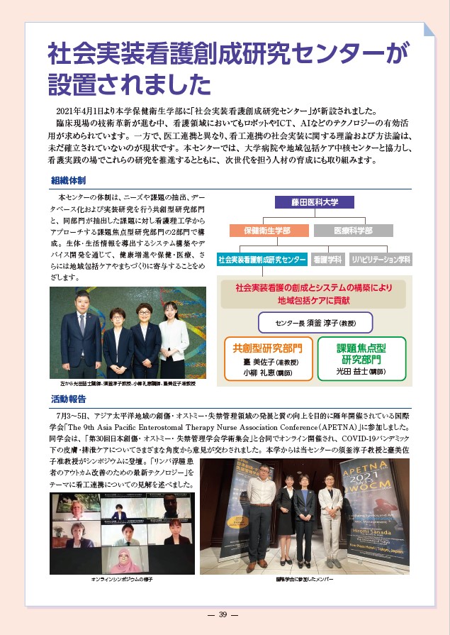 藤田学園広報誌「私立大学われを創りき」に須釜淳子教授紹介と社会実装看護創成研究センター活動報告が掲載されました。