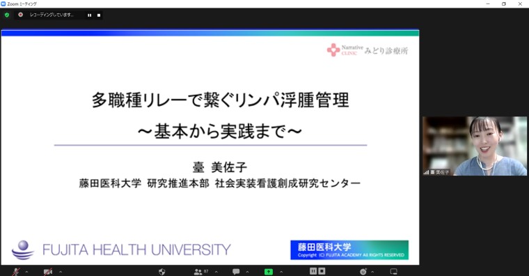 ナラティブクリニックみどり診療所主催のリンパ浮腫勉強会で、臺 美佐子准教授が講義しました。125名がご参加登録され、当日リンパ浮腫管理に関心のある様々な職種の方々がご参加くださいました。