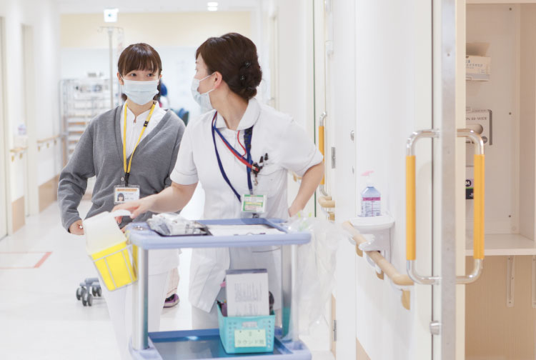 診療参加型臨床実習は、学生が医療チームの一員として医療現場に携わることで、医師としての知識や技術、思考や姿勢などを学ぶことを目的としています。本学は、全国に先駆けてこれを導入。4年次の10月から1年間に全48週の臨床実習を設け、1年のほとんどを病棟で過ごし、医療の質や安全への高い意識と経験値を身につけます。