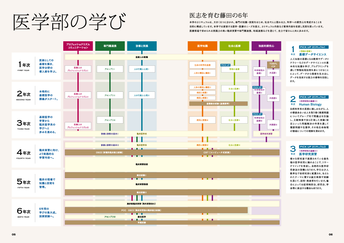 基本的な医学知識や一般教養、語学などを学び、素養を身につけるのはもちろんですが、1 年次より「早期臨床体験」や「医療コミュニケーション」を実践的に学びます。これにより〝生きた〟医療現場の実際をいち早く体感し、かつチーム医療への意欲を高め、医療人としての自覚、責任感を養います。また、「基礎教室体験実習」では、科学的な探究心も養い、医学研究者としての第一歩を踏み出します。