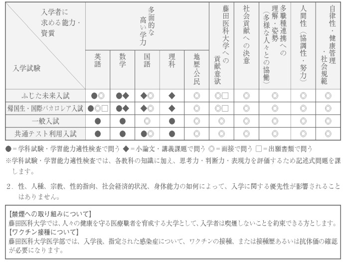 - 独創的な学究精神を持った謙虚で誠実な医師の育成を使命とする藤田医科大学医学部は、卒業までに身につける能力として卒業コンピテンス・卒業コンピテンシーを定めました。本学でこれらを達成するために必要な能力・資質を有する者として、以下のような人の入学を求めています。