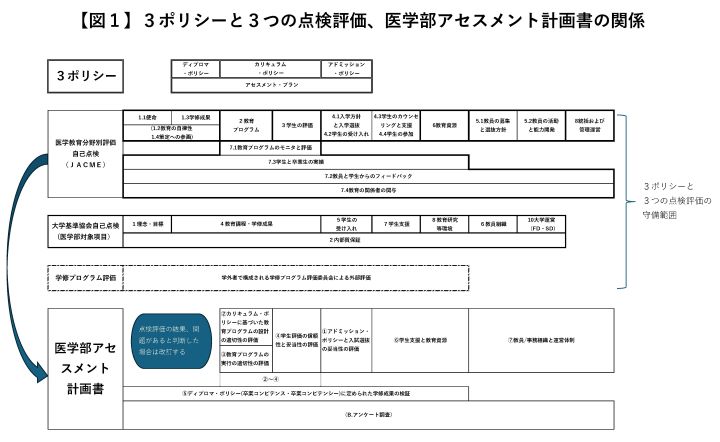 3ポリシーと3つの点検評価(①医学教育分野別評価基準に基づく点検評価、②大学基準協会の点検・評価項目に基づく点検評価、③学外委員により構成される藤田医科大学医学部学修プログラム評価委員会による外部評価、)の関係は図1の通りとなります。