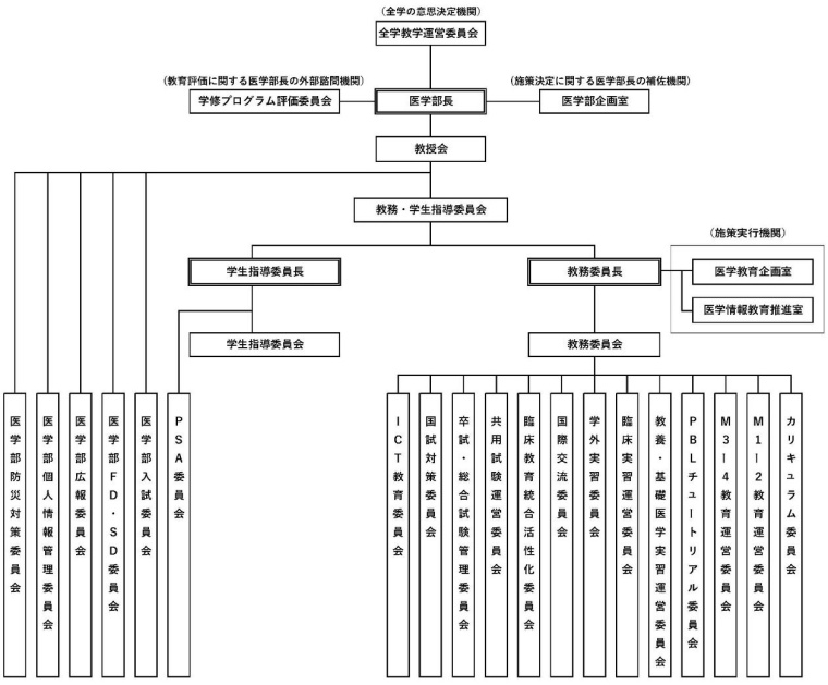 医学部の各種方針は、医学部長、副医学部長、教務委員長、学生指導委員長と医学部長が指名する教職員により構成される医学部執行部会で策定され、その方針に基づいて各委員会で具体的方策が協議され、教務・学生指導委員会、医学部教授会、全学教学運営委員会での審議を経て、正式に決定されます。