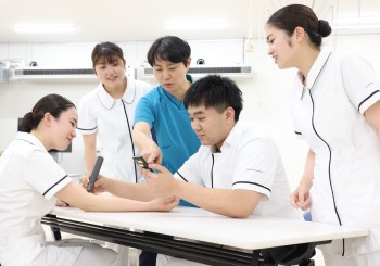 「基本看護技術」では、血圧測定や体位変換などの看護技術を学びます。授業時間外にも技術が練習できるよう、教材開発や学習促進のための支援に取り組んでいます。また、「看護過程展開論」では、看護を具体的に実践するための考え方の一つである看護過程を学びます。さらに近年、穿刺技術や排便ケア等で看護師が活用し始めている超音波検査装置(エコー)によるアセスメントを演習の中に組み込んでおり、最新の技術を学べる環境があります。