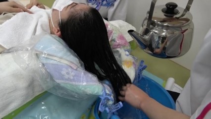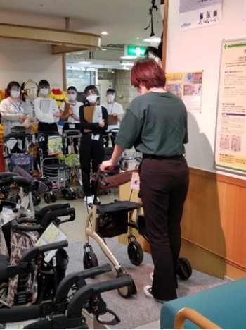 看護の対象は、生活者です。日常生活の支えとなる福祉用具について、「なごや福祉用具プラザ」に見学実習に行き、自立支援などを学んでいます。また自宅にある物品を用いて、洗髪パッドを作成し洗髪演習を行っています。