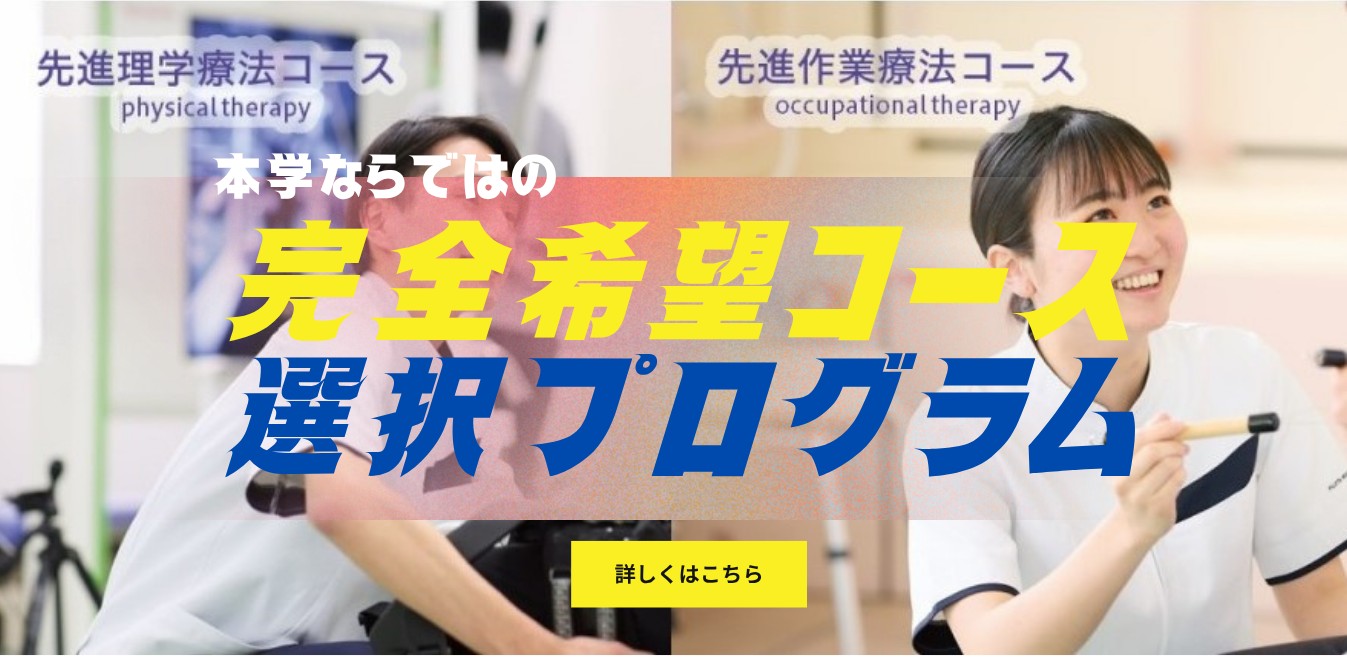 総合型選抜・推薦入試を除く入学試験によって入学した学生は、2年前期までを履修後、先進理学療法コースと先進作業療法コースのうち、どちらか一方を希望により選択します。適切なコース選択を支援するために、本学ならではのプログラムが用意されています。