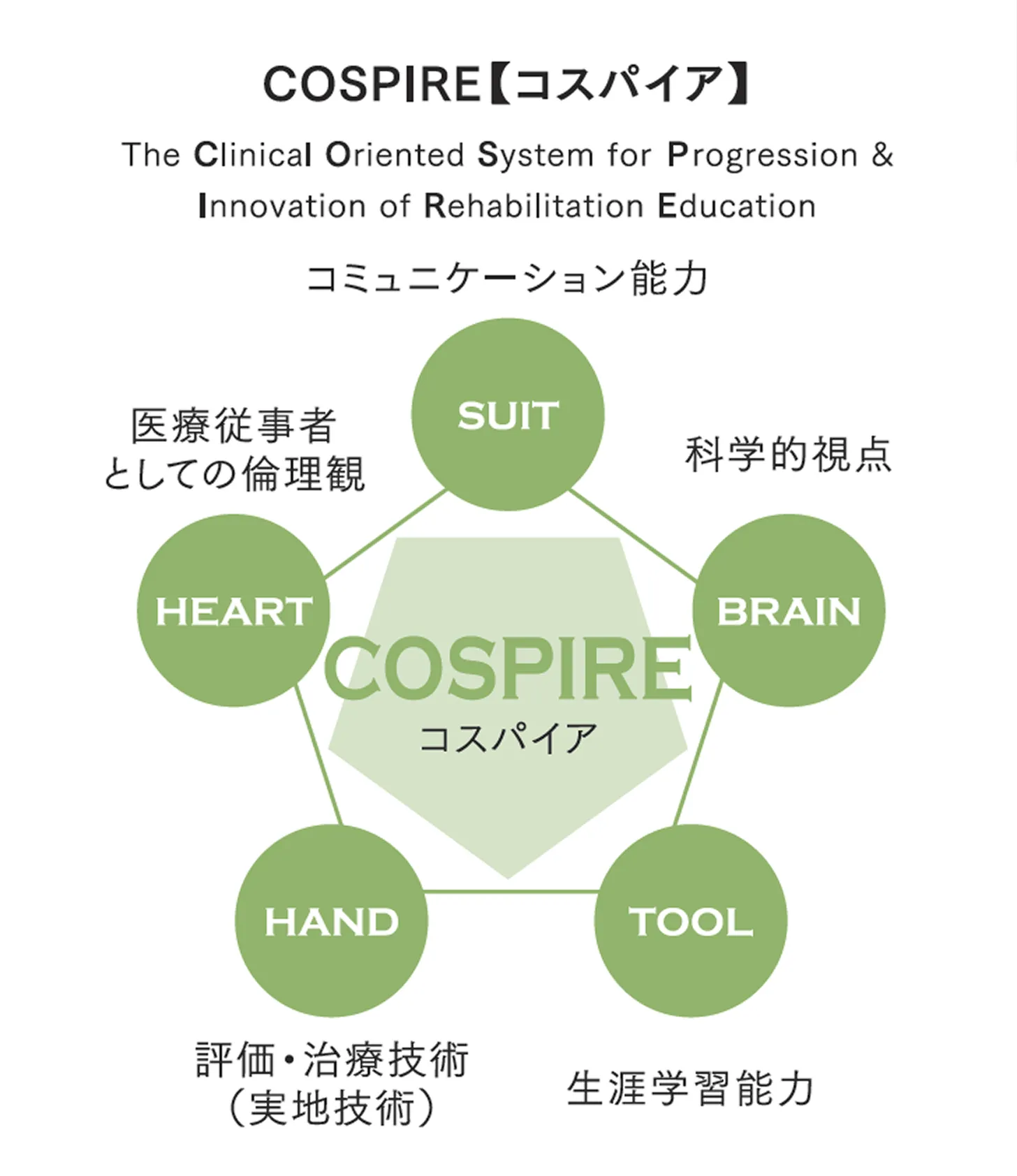 COSPIREは、一流の臨床家が持つ優れた知識、思考、そして技能を体系的かつ確実に学ぶための方略です。学科教員はもちろん、大学スタッフとして実際にリハビリテーション医療を行っている理学療法士、作業療法士、言語聴覚士、リハビリテーション科専門医をはじめとする多様な医療/医学/福祉専門家が講師陣となり、皆さんと接します。