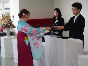 藤田学園全体での式の後、卒業生一人ずつへ学科長より卒業証書が授与されました。卒業生の表情からは、4年間の大学生活を終えた達成感と、今後の社会人としての新生活への期待感が強く感じられました。教員一同、卒業生のこれからの活躍がとても楽しみです。