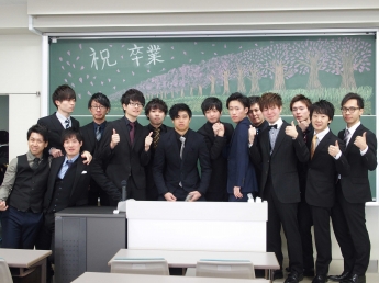 後輩からのお祝いのイラストを前に 作業療法専攻4年生の教室にて