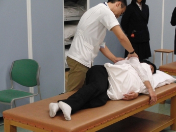 理学療法の手技を体験 「肩の動きがよくなるといいな」