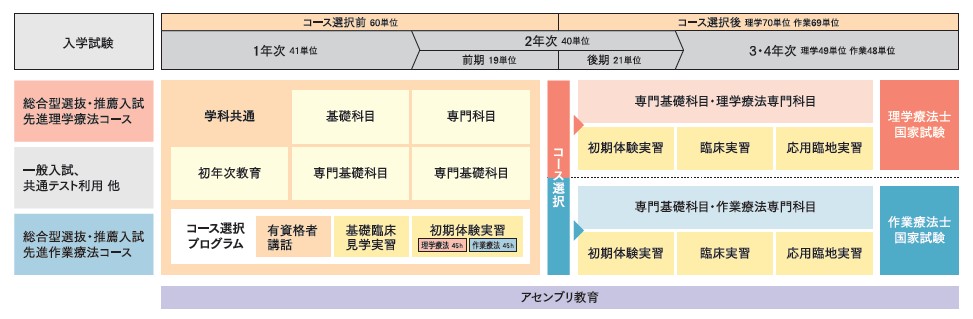総合型選抜・推薦入試を除く入学試験で入学した学生は、1年次から2年次前期までの学修を終えた後、「先進理学療法コース」または「先進作業療法コース」のいずれかを選択します。各職種の専門性を正しく理解したうえで進路を選択できるよう、本学では独自のプログラムを用意しています。
