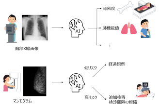 検診などのプライマリケアで使用されることを想定した胸部単純X線画像やマンモグラムを用いた病気の早期検出に関するAIの研究を行います。特に、現在の研究の中心は、目視では確認できず、診断の対象とならないような異常のわずかな兆しをAIの目を通すことで抽出することです。胸部単純X線画像からは、呼吸機能や骨密度などの情報を含んでいる可能性が見つかってきています。マンモグラムを用いた研究では、乳がんの発症リスクを予測する研究を行っています。