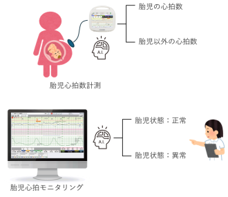 胎児の健康状態を把握するために胎児心拍の音声信号が測定されます。測定された胎児心拍から胎児の異常をモニタリングし、早期にアラートを提示するAIを研究しています。また、母体の心拍や他の音声信号が紛れ込むことがあり、胎児心拍と取り違える判断ミスを防ぐ信号源判定システムの研究開発も進めています。これらは医療機器メーカーと協力して製品化を目指しています。