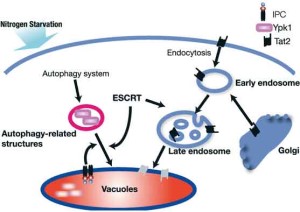 冬虫夏草の一種であるタイワンツクツクホウシを宿主とするIsalia sinclairii菌から強い免疫抑制活性を持つ物質として単離されたISP-1 (immunosuppressant product-1) は、その構造がスフィンゴシンに類似しており、スフィンゴ脂質の生合成を阻害することが明らかにされました。私たちは、このISP-1を用いた遺伝子スクリーニングにより、酵母においてISP-1耐性遺伝子の一つとしてYPK1を単離し、スフィンゴ脂質シグナル伝達と呼ぶべきシグナル伝達経路の存在を明らかにしてきました。その中で、タンパク質を翻訳することで、細胞増殖を制御するAGCキナーゼであるYpk1が、栄養源の一つである窒素源の飢餓時に、バルクのオートファジーに先立ち、一部オートファジー経路を利用して選択的に分解されることが明らかになりました。アミノ酸飢餓時にアミノ酸の消費を積極的に抑制して節約する、ともとれる、私たちが発見したこの経路はこれまで知られていない新規の経路であり、その分子メカニズムを明らかにしようとしています。