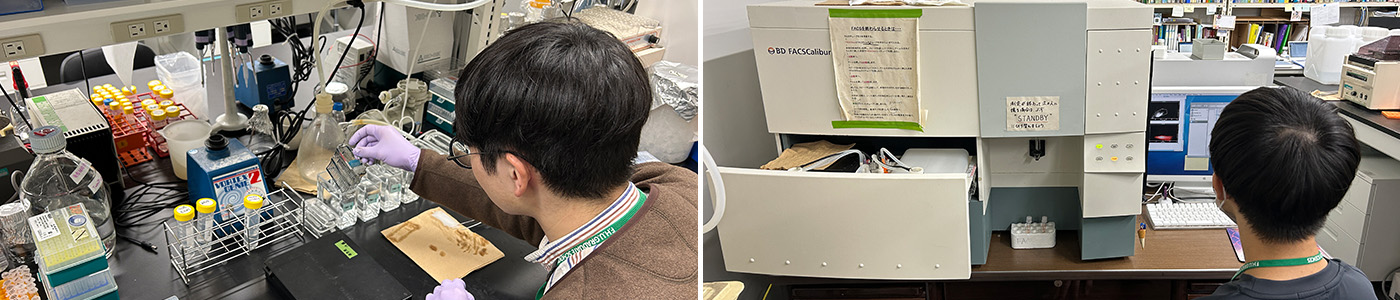 本分野は研究推進ユニットとして、医療科学部の2学科(医療検査学科・放射線学科)双方から学生を受け入れており、学科の垣根を超えて研究活動を行なっています。生化学・分子生物学・細胞生物学・免疫学など多岐にわたる手法を用いた研究を通じて、臨床検査技師・診療放射線技師としての仕事に限らず、幅広く活躍するために研究マインドを備える人材の育成を目指しています。大学院では、研究者の育成を目標として、主体的に研究を行えるよう指導を行います。