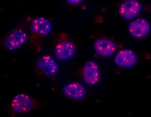 放射線が照射され生き残った細胞は放射線抵抗性を獲得します。放射線抵抗性獲得の詳細なメカニズムについては未だ不明なままです。我々は放射線照射によって細胞から分泌される液性因子に着目し、がん細胞が放射線抵抗性を獲得するメカニズムについて研究しています。液性因子を投与した細胞に放射線を照射しコロニー形成法や53BP1蛍光免疫染色法による解析を行い、さらに活性酸素の関与についても研究を行います。(玉利勇樹)