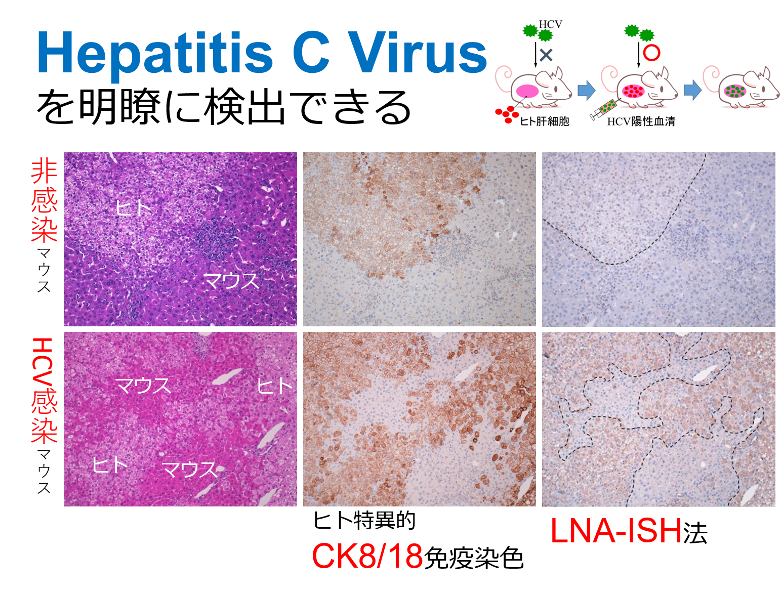 LNA-DNA oligoprobeとタイラマイド増感を組み合わせた高感度in situ hybridization法によって、免疫染色では検出困難なHCVを明瞭に検出することができる。