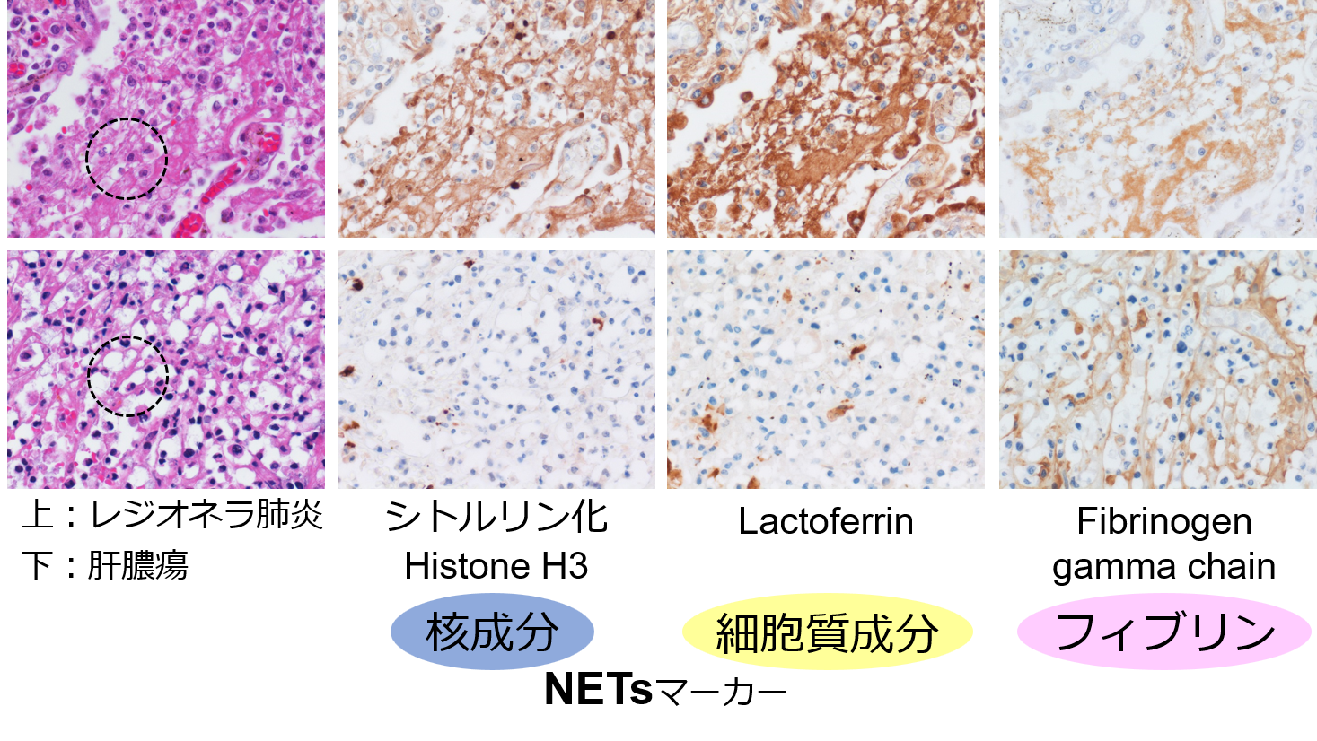 太い線維の場合、NETsとフィブリンの共存(NETsマーカー陽性、フィブリンマーカー陽性)、あるいはフィブリン(NETsマーカー陰性、フィブリンマーカー陽性)だと判定できる。(上段:レジオネラ肺炎、下段:肝膿瘍)