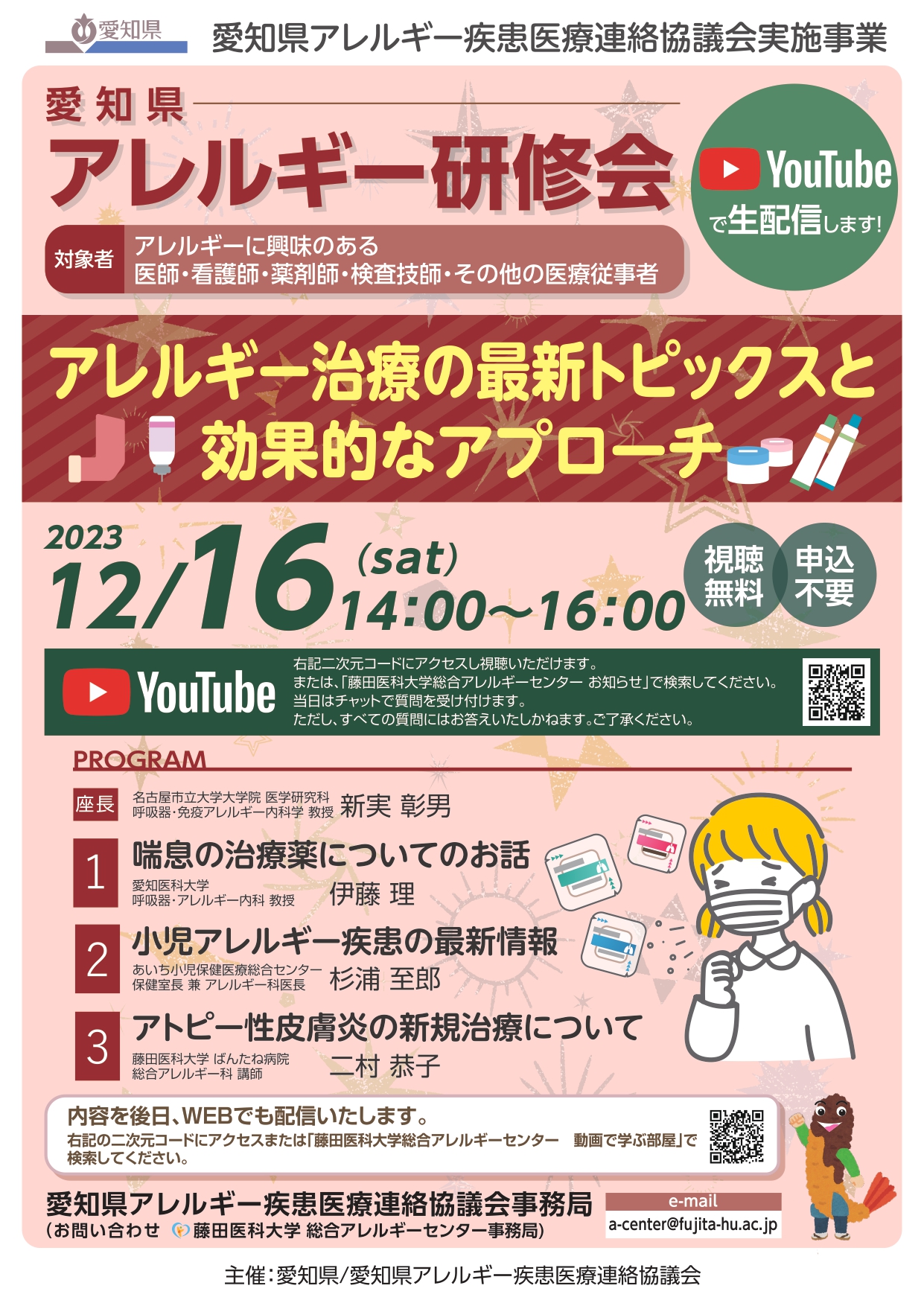 2023年12月16日(土)14:00~16:00に愛知県アレルギー疾患医療連絡協議会事業として、アレルギーに興味のある医師・看護師・薬剤師・検査技師・その他医療従事者の方を対象にYouTubeLive配信にてアレルギー研修会を開催致します。 参加費無料、事前申込不要。どなたでもご視聴いただけます。
