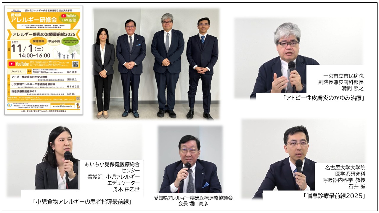 2025年11月1日(土)14:00~16:00に愛知県アレルギー疾患医療連絡協議会事業として、アレルギーに興味のある医師・歯科医師・薬剤師・看護師・臨床検査技師・管理栄養士その他の医療従事者を対象にYouTube LIVE配信にてアレルギー研修会を開催いたしました。休日にもかかわらず多くの方にご聴講いただきありがとうございました。リアルタイムで質問にもお答えいただき有意義な時間となりました。