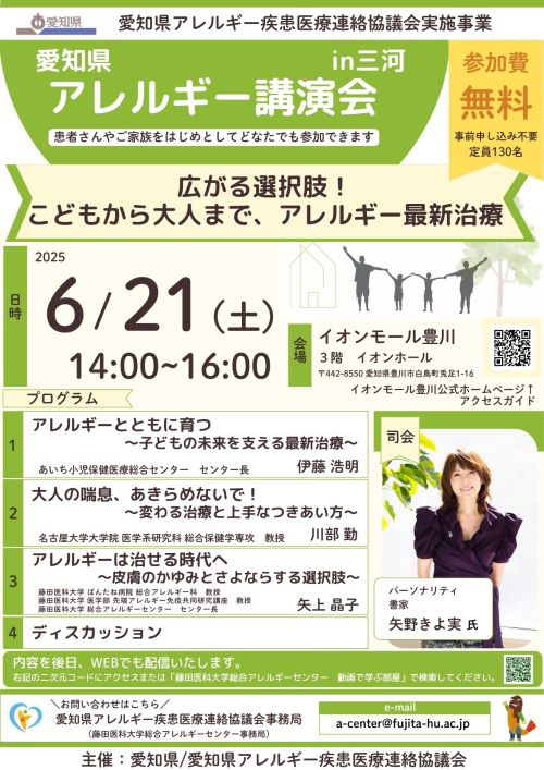 2025年6月21日(土)、愛知県アレルギー疾患医療連絡協議会事業として「愛知県アレルギー講演会」をイオンモール豊川 イオンホールにて開催いたしました。