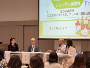 今回の講演会では、愛知県アレルギー疾患医療拠点病院(県が指定する、アレルギー医療の中心的役割を担う病院)に所属する医師が登壇し、選択肢が広がりつつあるアレルギーの最新治療について、わかりやすく解説いたしました。司会にはパーソナリティーであり書家でもある矢野きよ実さんをお迎えし、専門的な内容もやさしく、時にユーモアを交えながら進行していただき、参加者の皆さまとともに非常に充実した時間を過ごすことができました。