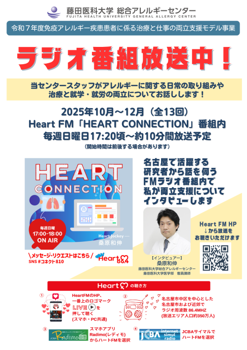 「 Heart FM」 の番組「HEART CONNECTION」(17:00~18:00、Heart Jockey 桑原 和伸)内で、当センターのスタッフが、患者さんやご家族が治療と就学・就労を両立できるよう日頃行っている支援についてお話しします。