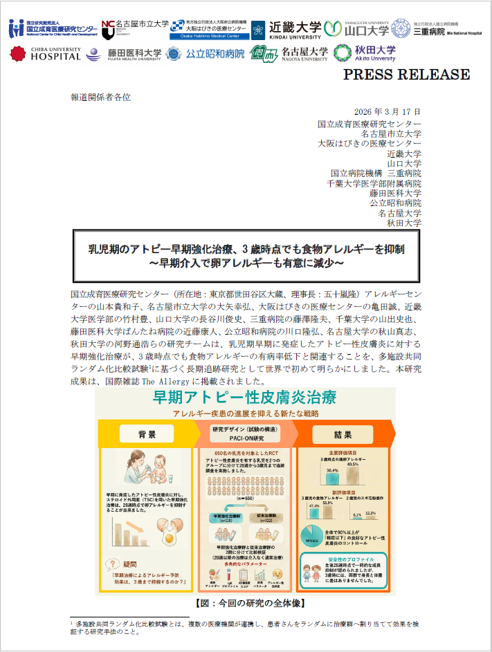 【共同プレスリリース配信のお知らせ】乳児期のアトピー早期強化治療、3 歳時点でも食物アレルギーを抑制 ~早期介入で卵アレルギーも有意に減少~