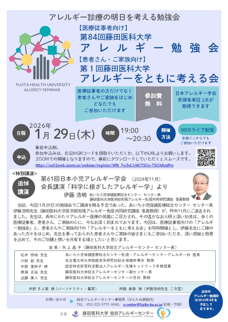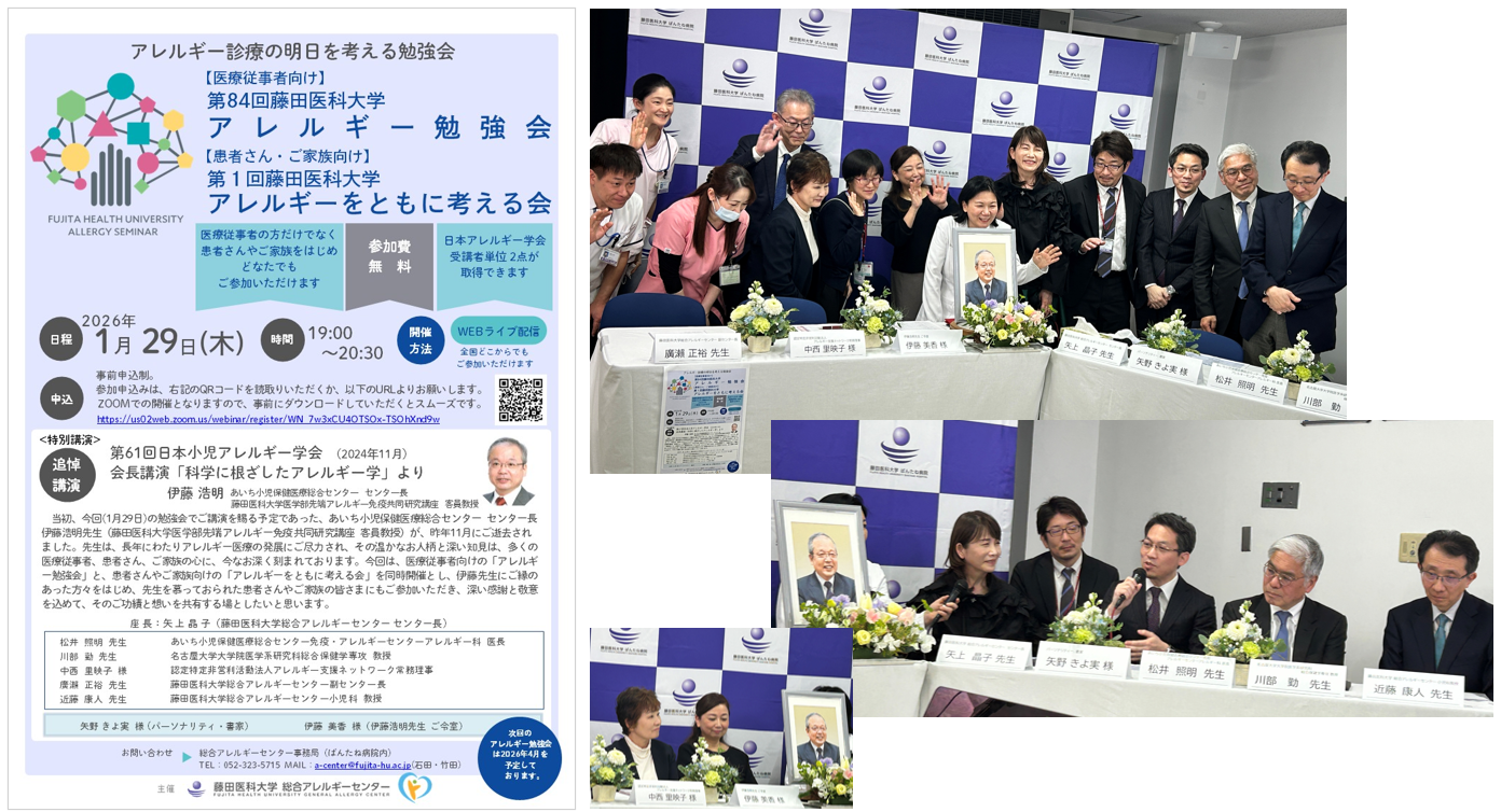 藤田医科大学総合アレルギーセンターでは、2026年1月29日(木)Webライブ配信にて「第84回藤田医科大学アレルギー勉強会」・「第1回藤田医科大学アレルギーをともに考える会」を開催いたしました。