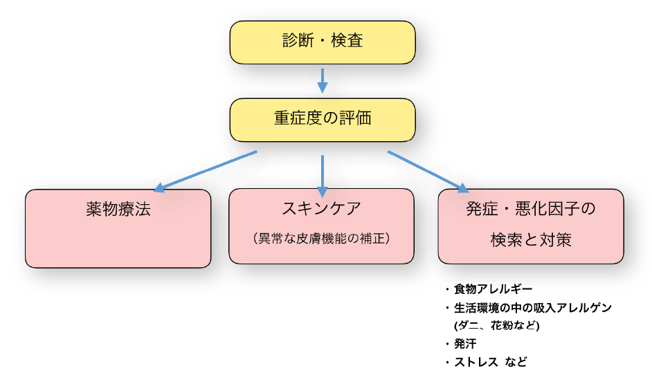 アトピー性皮膚炎は、薬剤を用いた治療のみではうまく改善しません。 薬物療法、スキンケア、悪化因子への対策 を適切に継続して行っていくことが患者さんの予後に影響します。 医師のみでなく、専門的な看護師、薬剤師、小児アレルギーエデュケーター、臨床心理士などが連携する医療体制が必要です。