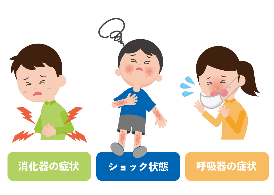 鶏卵、牛乳、小麦、ピーナッツ、果物、魚卵、甲殻類、ナッツ類、ソバ、魚類などがあります。