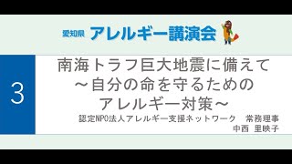 | 「南海トラフ巨大地震に備えて~自分の命を守るためのアレルギー対策~」 認定NPO法人アレルギー支援ネットワーク 常務理事 中西 里映子 |