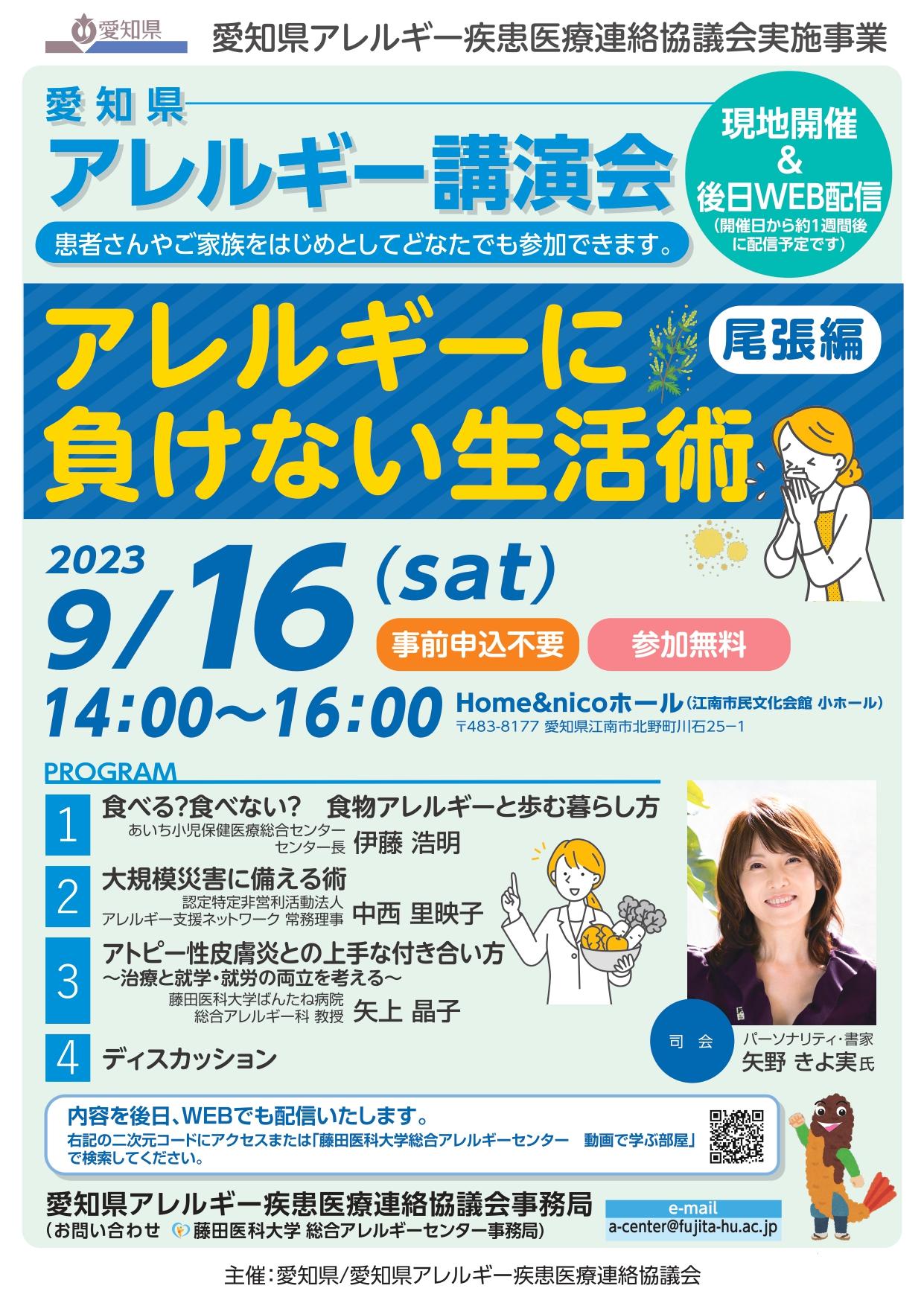 2023年9月16日(土)14:00~16:00に愛知県アレルギー疾患医療連絡協議会事業として、アレルギーに興味のある方、患者さんやご家族を対象にHome&nicoホール(江南市民会館)小ホールにてアレルギー講演会を開催致します。