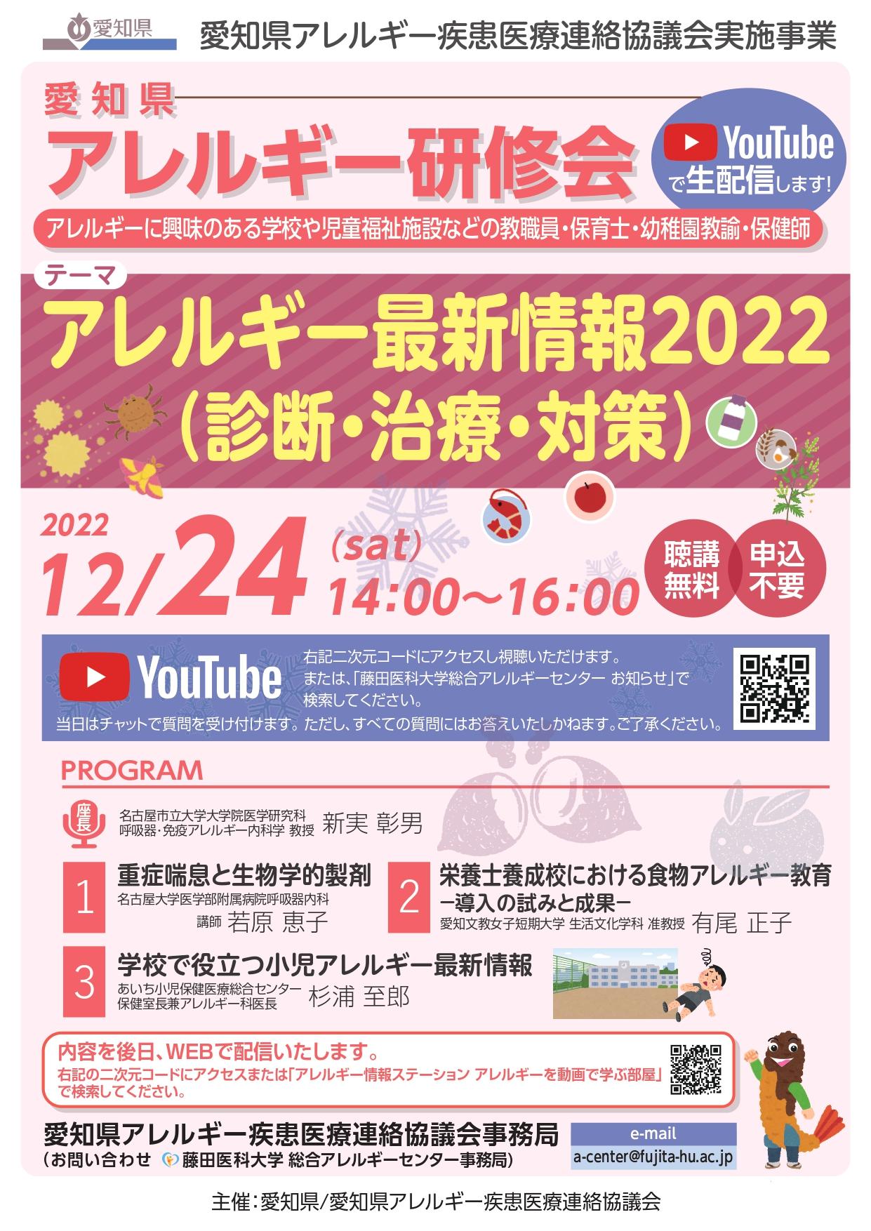 2022年12月24日(土)14:00~16:00に愛知県アレルギー疾患医療連絡協議会事業として、学校や児童福祉施設などの教職員・保育士・幼稚園教諭・保健師などの教育関係者を対象にYouTubeLIVE配信にてアレルギー研修会を開催致します。参加費無料、事前申込は不要です。どなたでも視聴いただけます。チラシにあるQRコード又は、URL:https://youtu.be/7-lksaMikw0をクリックして、ぜひご視聴ください!