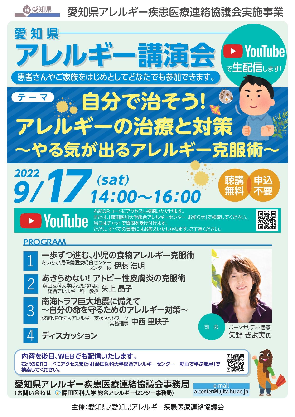 2022年9月17日(土)14:00~16:00に愛知県アレルギー疾患医療連絡協議会事業として、アレルギーに興味のある方、患者さんやご家族を対象にYouTubeLIVE配信にてアレルギー講演会を開催致します。参加費無料、事前申込は不要です。どなたでも視聴いただけます。チラシにあるQRコード又は、URL:https://youtu.be/4nJVwAd56fE をクリックして、ぜひご視聴ください!