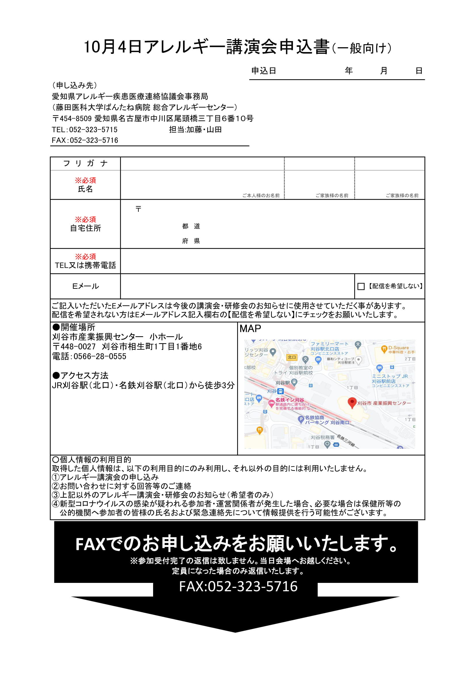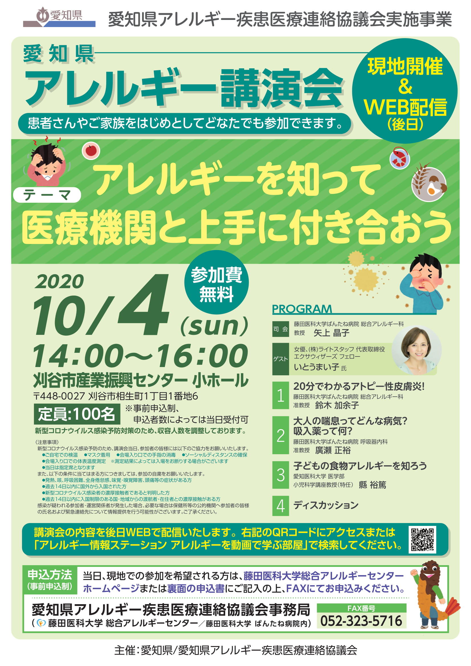2020年10月4日(日)14:00~16:00に愛知県アレルギー疾患医療連絡協議会事業として、アレルギーに興味のある方、患者さんやご家族を対象に刈谷市産業振興センターにてアレルギー講演会を開催致します。