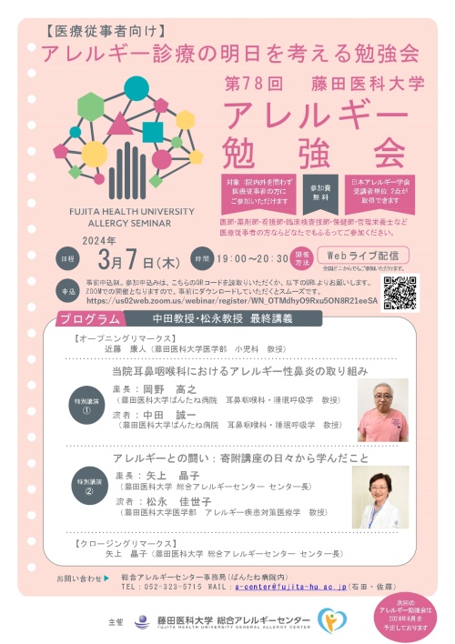 藤田医科大学総合アレルギーセンターでは、2024年3月7日(木)Webライブ配信にて「第78回藤田医科大学アレルギー勉強会」を開催いたします。