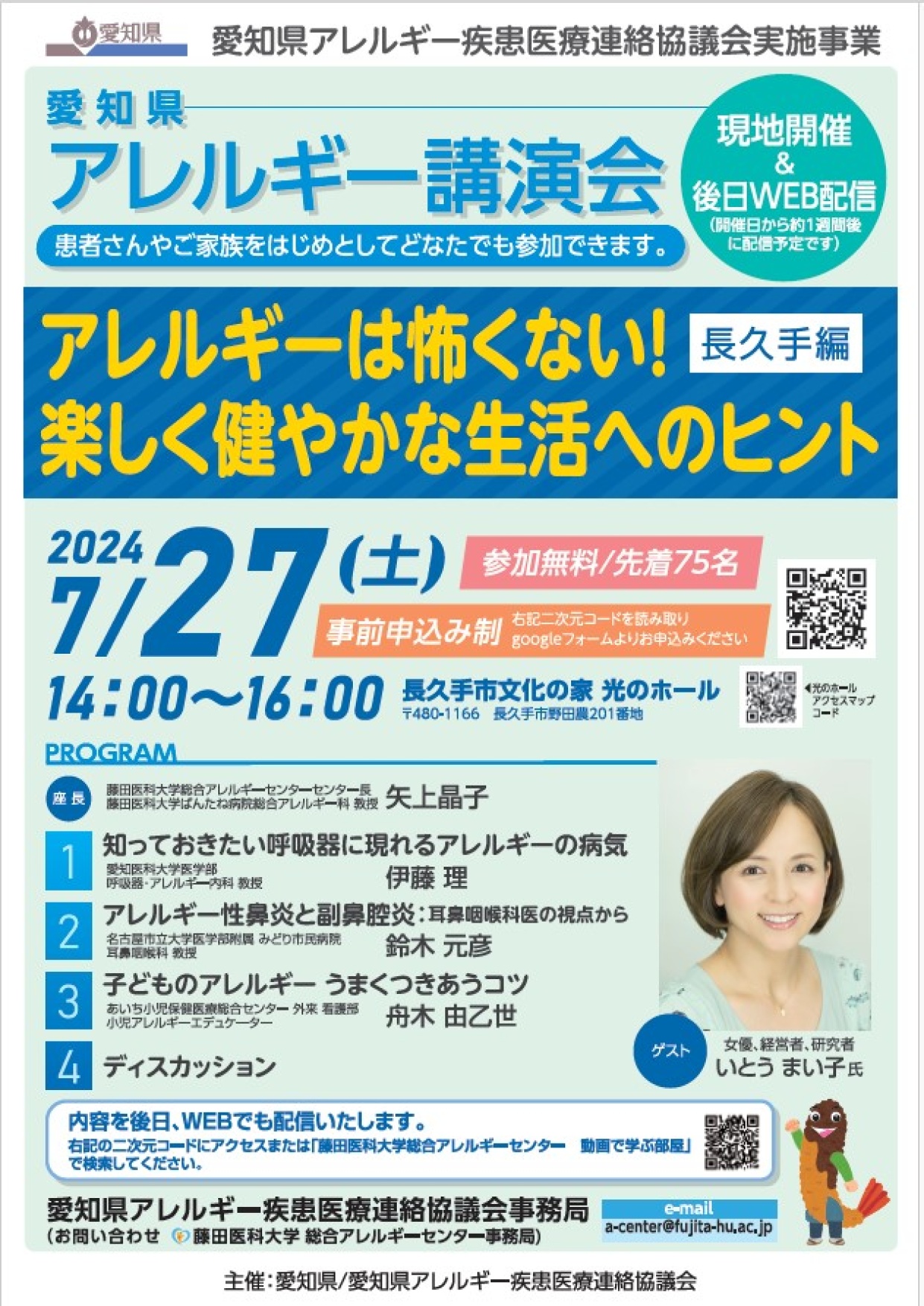 愛知県アレルギー疾患医療連絡協議会事業として、愛知県アレルギー講演会を対面開催いたしました。