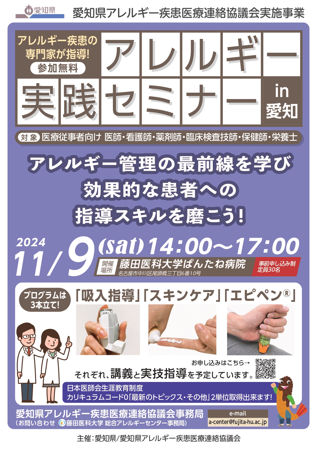 ◆日 時:2024年11月9日(土)14:00~17:00 ◆場 所:藤田医科大学ばんたね病院 ◆テーマ:アレルギー管理の最前線を学び効果的な患者への指導スキルを磨こう! ◆プログラム(それぞれ講義と実技指導を予定) 1)吸入指導 2)スキンケア 3)エピペン🄬 ◆主 催:愛知県/愛知県アレルギー疾患医療連絡協議会 ※日本医師会生涯教育制度カリキュラムコード0「最新のトピックス・その他」2単位取得出来ます
