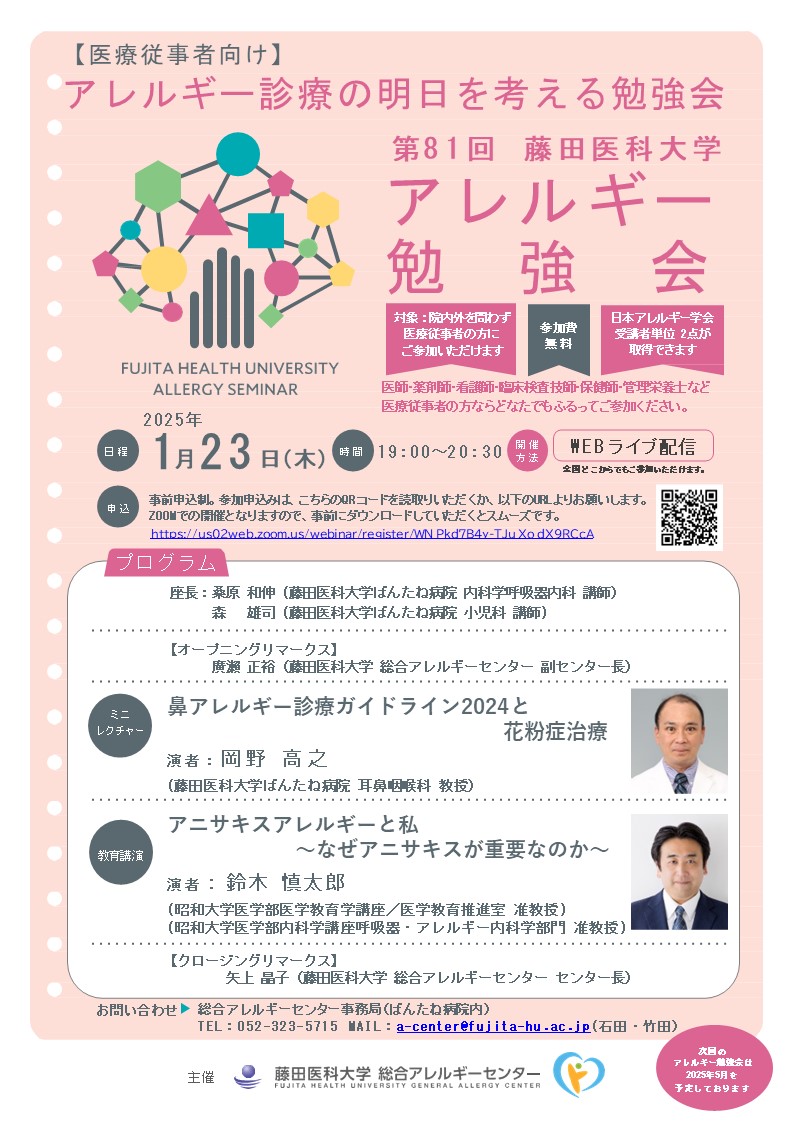 藤田医科大学総合アレルギーセンターでは、2025年1月23日(木)Webライブ配信にて「第81回藤田医科大学アレルギー勉強会」を開催いたします。