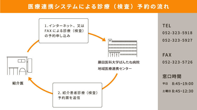 患者さんには、当日、藤田医科大学ばんたね病院の紹介受付へお越しいただき、「紹介患者検査予約票」「診療情報提供書」「保険証」をご提出いただくようご案内ください。