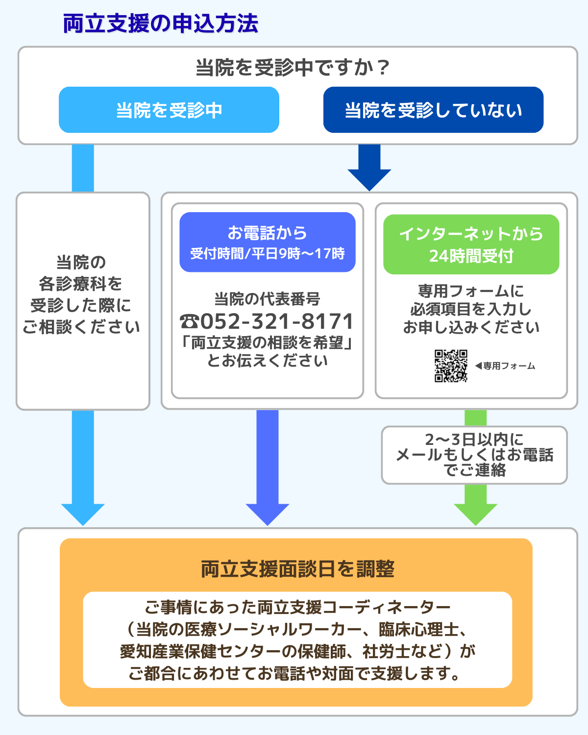 ・お電話 052-321-8171(受付時間/平日9時~17時) 「両立支援の相談を希望」とお伝えください or ・インターネット お申込 Googleフォーム(24時間受付)